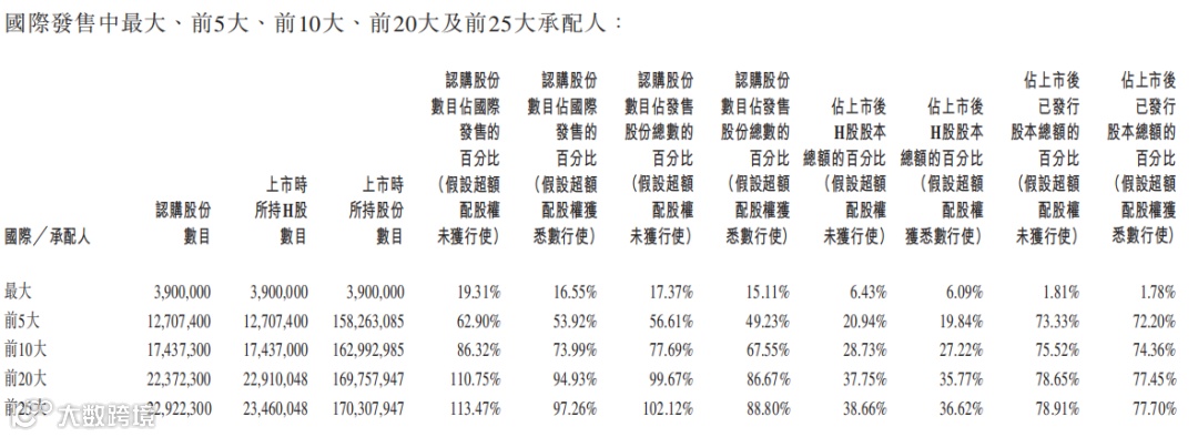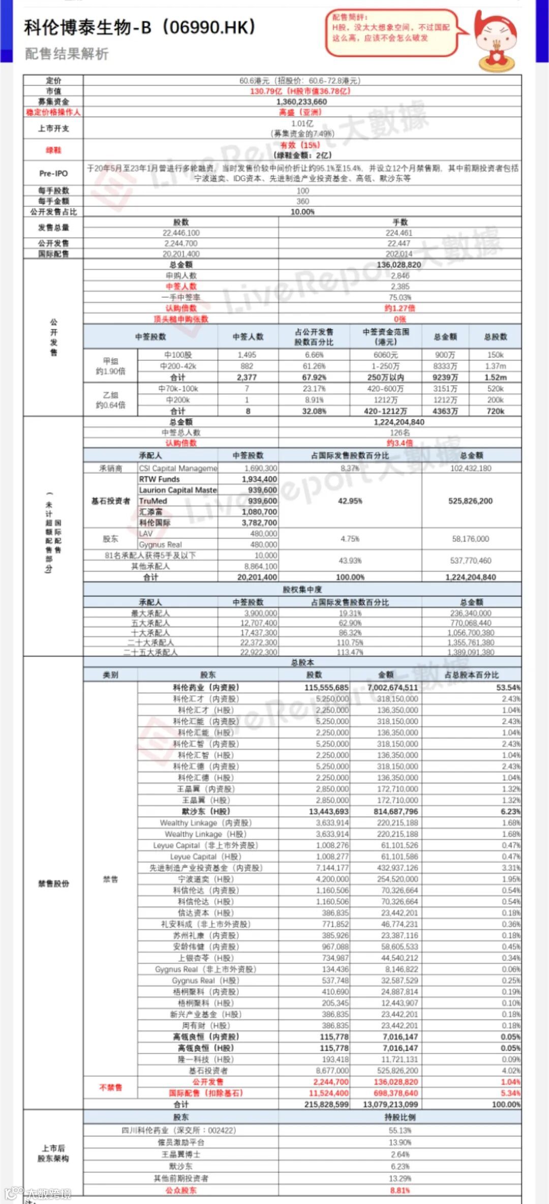 科伦博泰生物国际配售总共126个人,其中62人中签一手,19人获配二至五手的, 仅仅是45人获配五手以上。即便是这样,前25大承配人还都拿走了113.47%国际发售的货(已获超额配股权).