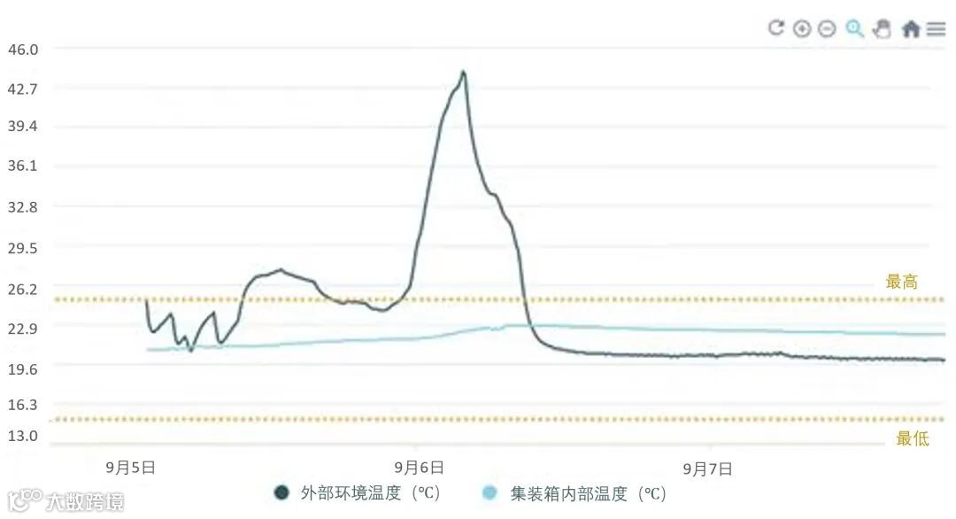 上个月,从中国上海出发,SkyCell为中国CDMO企业将高价值原材料药品运往日本关西的大阪府和歌山县,完成从中国运往日本市场的首秀。这批运往日本的货物安全顺利地交付,没有出现任何温度偏差。在3天的运程中,药品经历了一次“山峰式”外部温度变化的挑战。冷链中途,环境温度忽然从低于26.2摄氏度,骤然升高抵达峰值,直接超过42.7摄氏度。但是在整个温度的突变中,SkyCell 1500X不受外界温度波动的影响,将集装箱内的温度安全地控制在20.8℃-22.9℃之间,保护高价值药品的安全。