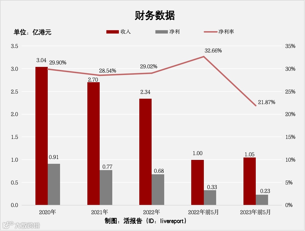 净利润分别约为港元0.91亿元、0.77亿元、0.68亿元、0.33亿元及0.23亿元,年复合增长率为-13.62%;