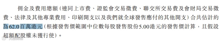 然后这个票招股书上按发售价中位数5.00港元计算,公开的上市所有开支总额约为6200万港元,募资额约1.42亿港元,占比约43.66%,开支相比募资额算是比较多的了,快接近一半了。