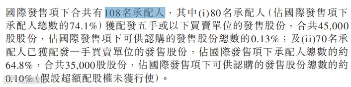 艾迪康控股国际配售总共108个人,其中70人中签一手,10人获配二至五手,仅仅28人获配五手以上。即便是这样,前25大承配人还都拿走了99.84%国际发售的货。