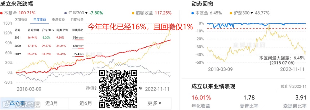 项目2:打新的下游是股票交易。大家没时间交易?不想股票被套?不想承受大幅回撤?可以去看看套利类的私募基金(100万起投)。如果大家钱在国内,可以找一些历史业绩低回撤,套利策略,日内t0类,cta,量化类的等的产品,比如下面这个,历史平均年化超过16%,今年历史回撤不到1%的,这些产品还不错,目前也还有额度。