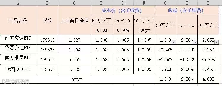 假如说每个月都有一个项目,一年下来12个,按方案一属于懒人模式了,这类项目基本上就当做类固收+的项目,基本上国内资金追求七八个点年化的是可以考虑,方案二需要择时,择时择得好单项目可能也有2~3个点的收益,不过也要做好亏损的准备。尤其是去除掉认购赎回费的成本之后,那收益就很不错了。比如下图这样能遇到两个吃大肉的etf,南方交运ETF上市后首日净值1.027,涨幅2.7%,标普500ETF上市后净值1.025涨幅2.5%,这种如果去掉0.8%认购费和0.5%赎回费,那这几个etf收益相当不错,那像南方消费ETF,也是亏了0.8%的。