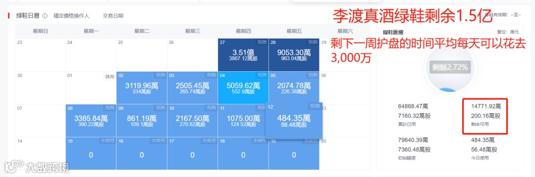 开盘绿鞋富瑞就开始来护盘了,绿鞋2375.04万港元首日就全部用完了,那即便是这种情况,首日依然暴跌了30%,国配砸盘砸得很凶,这首日又一点情面都没留啊,直接跌了25%。