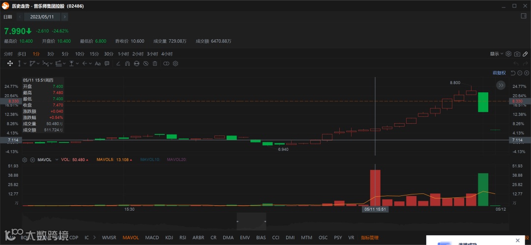 自己人在回购,之后就是垃圾时间,一直到尾盘最后的 6 分钟又拉了一波,9.3+84.5+32.3+0.6+4+28.1=158.8,加起来总共成交了700多万,暗盘确实是花了几百万作为回购护盘的。