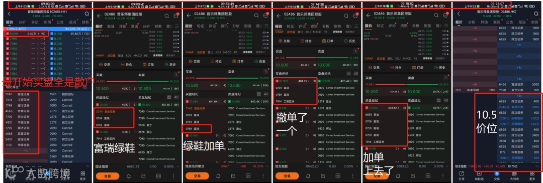 暗盘开盘之后发行价的就有大单在抛,暗盘一开盘10.5的位置9646席位就有131k的大单子挂在,开盘之后,也在发行价10块5的位置,不断有大单被买入交易。开盘或者几分钟不断的有几百K的单子都是被吃的,