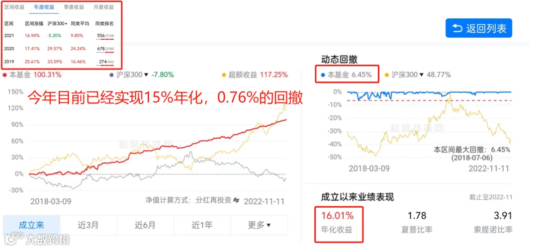 项目2:打新的下游是股票交易。大家没时间交易的,可以去看看套利类的私募基金(100万起投)。如果大家钱在国内,可以找一些低回撤,收益还不错的,日内t0类的,cta,量化类的,套利性质类等待这些的策略的产品,比如下面这个,历史平均年化超过16%,今年回撤不到1%的套利产品,目前也还有额度。
