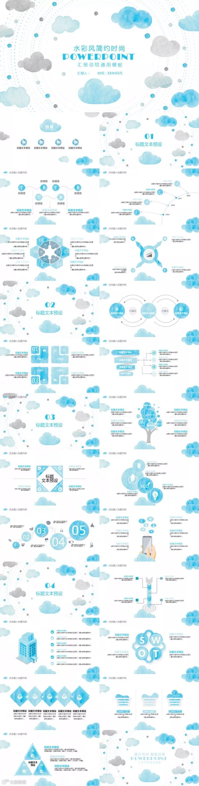 免费 | 蓝色清新水彩风云朵背景PPT模板