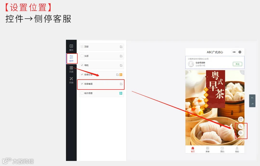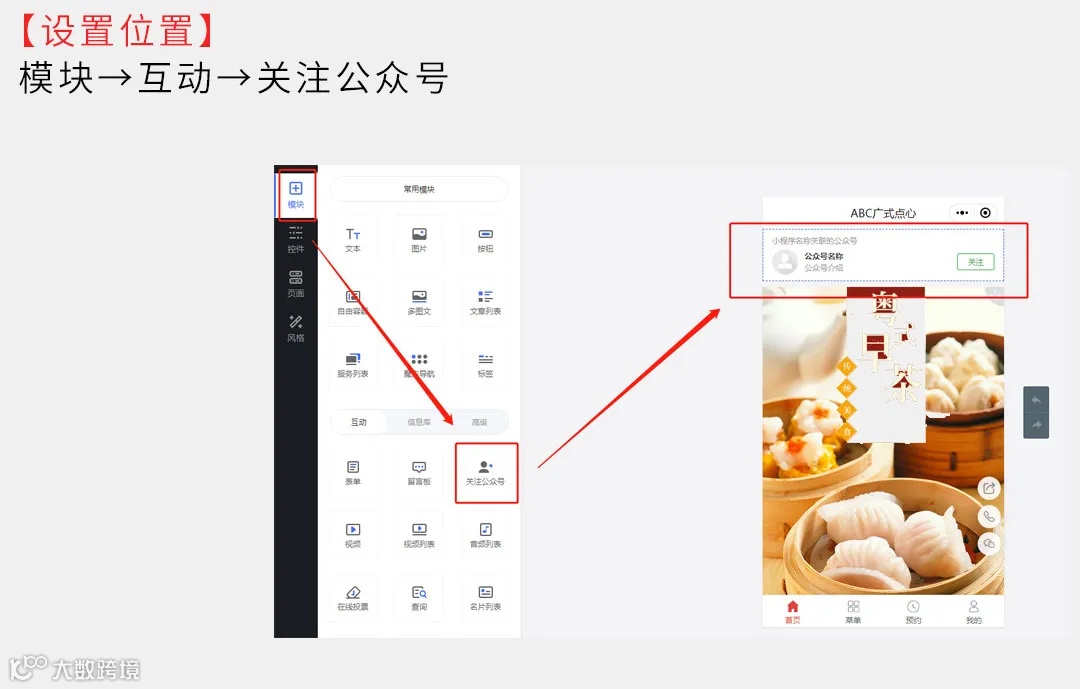 现在有一个广式点心酒楼,通过小程序对酒楼的点心进行展示,吸引用户预约点心并且到线下消费,同时想引导用户关注酒楼的公众号、参与活动等,增加用户对酒楼的粘性。