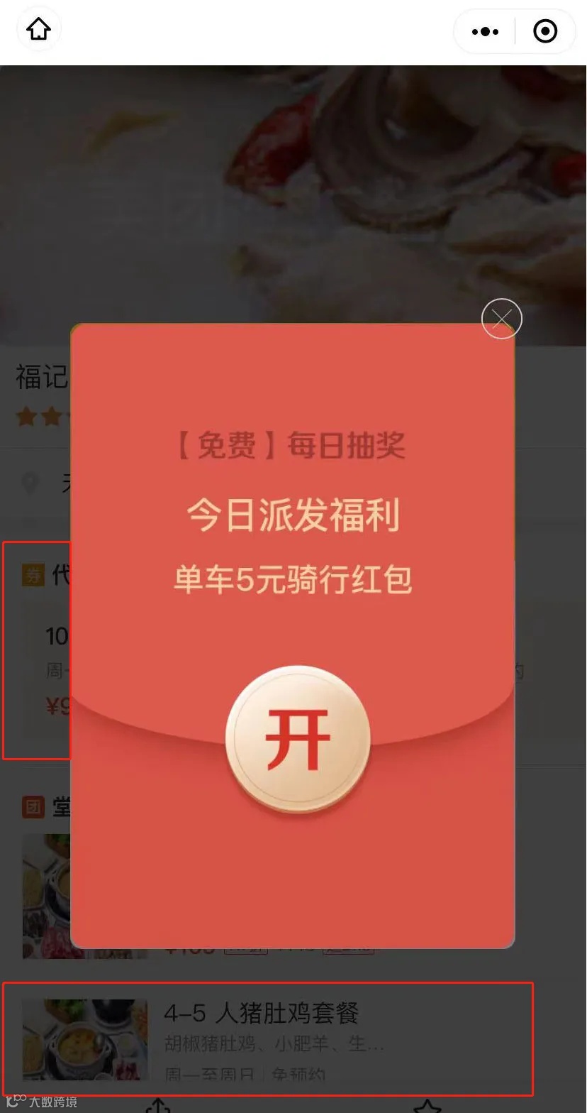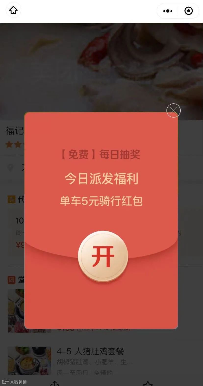 回到文章开头提到的猪肚鸡小程序,进入落地页后首先弹出了单车骑行的红包福利,单车骑行的优惠券和用户想看的美食套餐没有关联,这会让用户对小程序的印象大打折扣。