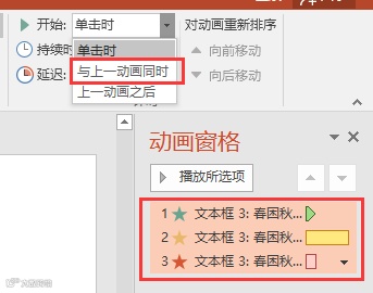 我们选中这三个动画,将它们的开始时间都设置为[与上一动画同时]。