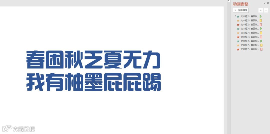 将最后一个文本框复制粘贴,将它的三个动画变为一个动画。