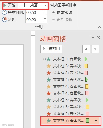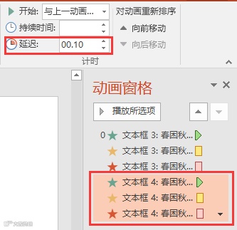 选中复制的第一个文本框,将这三个动画的延迟时间设置为00.10秒,其他设置保持不变。