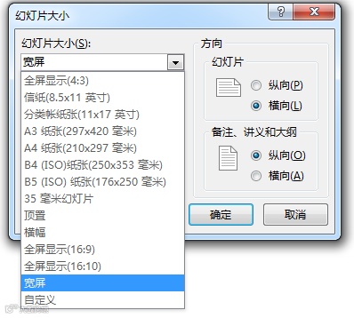 你也可以选择其他的尺寸,甚至可以自己定义。选择“自定义幻灯片大小”就可以进行修改了。
