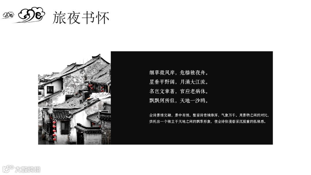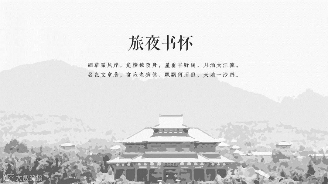 全诗景情交融,景中有情。整首诗意境雄浑,气象万千。用景物之间的对比,烘托出一个独立于天地之间的飘零形象,使全诗弥漫着深沉凝重的孤独感。