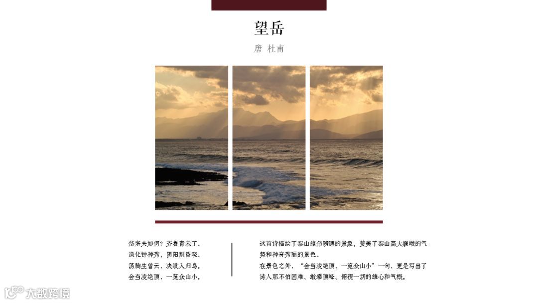在景色之外,“会当凌绝顶,一览众山小”一句,更是写出了诗人那不怕困难、敢攀顶峰、俯视一切的雄心和气概。