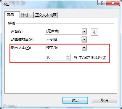比如,我们把这个动画设置为“按字/词”,并且把延迟设置为30%。