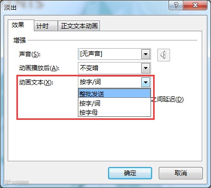 在效果增强中,动画文本有三种选项——“整批发送”、“按字/词”和“按字母”。