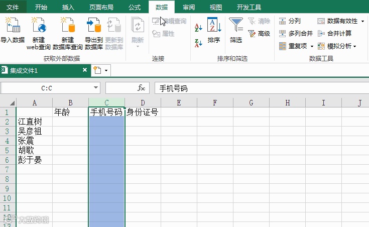 选中我们要输入手机号码的一列。选择功能区的数据选项,并在数据工具组里执行数据有效性。