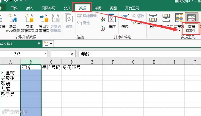 与之前一样,选中我们要输入年龄的一列。选择功能区的数据选项,并在数据工具组里执行数据有效性。