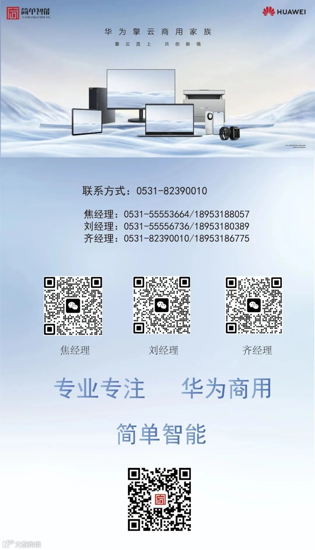 山东简单智能是华为商用授权分销商、360数字安全山东总经销,信创一站式增值服务商,主营华为擎云商用电脑、平板、IdeaHub大屏、视频会议、服务器、信创、软件方案,是华为、360、麒麟、统信、铠大师、WPS、永中、福昕鲲鹏等厂家授权分销商。