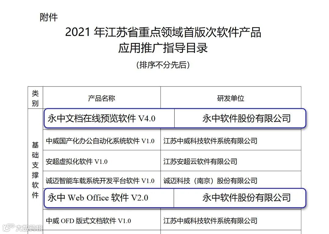 近日,江苏省工业和信息化厅公布了《2021年江苏省重点领域首版次软件产品应用推广指导目录》,永中软件办公产品的“永中DCS文档在线预览软件V4.0”和“永中Web Office软件V2.0”两款产品双双入选,为广大用户提供首购首用参考。