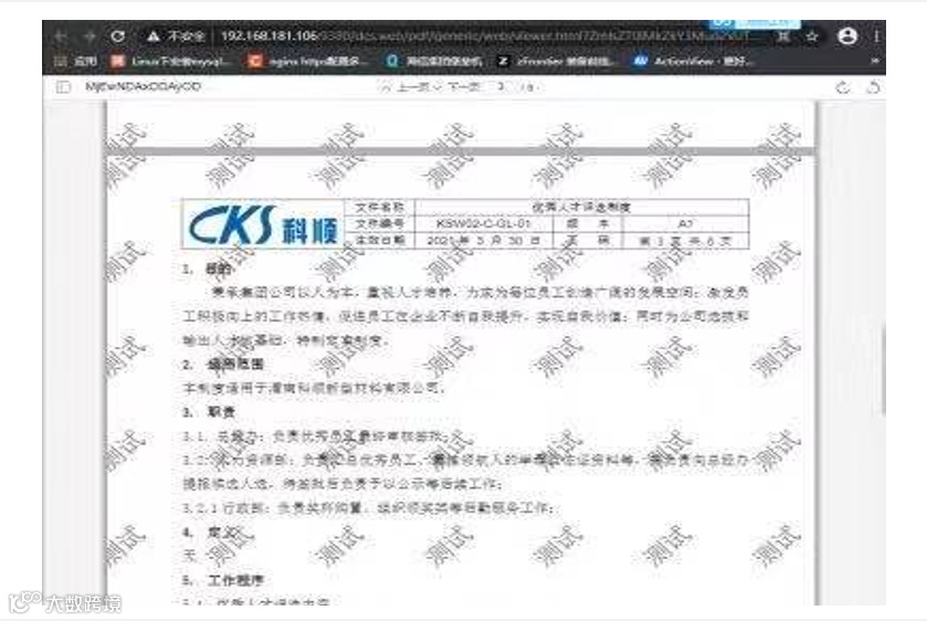 永中DCS提供多种文档权限设置功能,例如静态水印功能。集成到内部系统后,可将员工工号、姓名及时间的水印嵌入文档中,还可跟随打印,有效避免源文件外传。不仅加强了保密效果,保障文档信息的流通安全,文档操作也有迹可查。