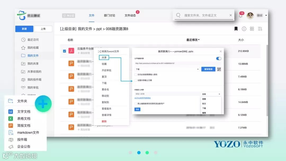 永中优云作为一个一站式、全平台、多终端的新一代办公产品,集中管理文档,便于内部高效协作,为客户提供一整套协作办公解决方案。