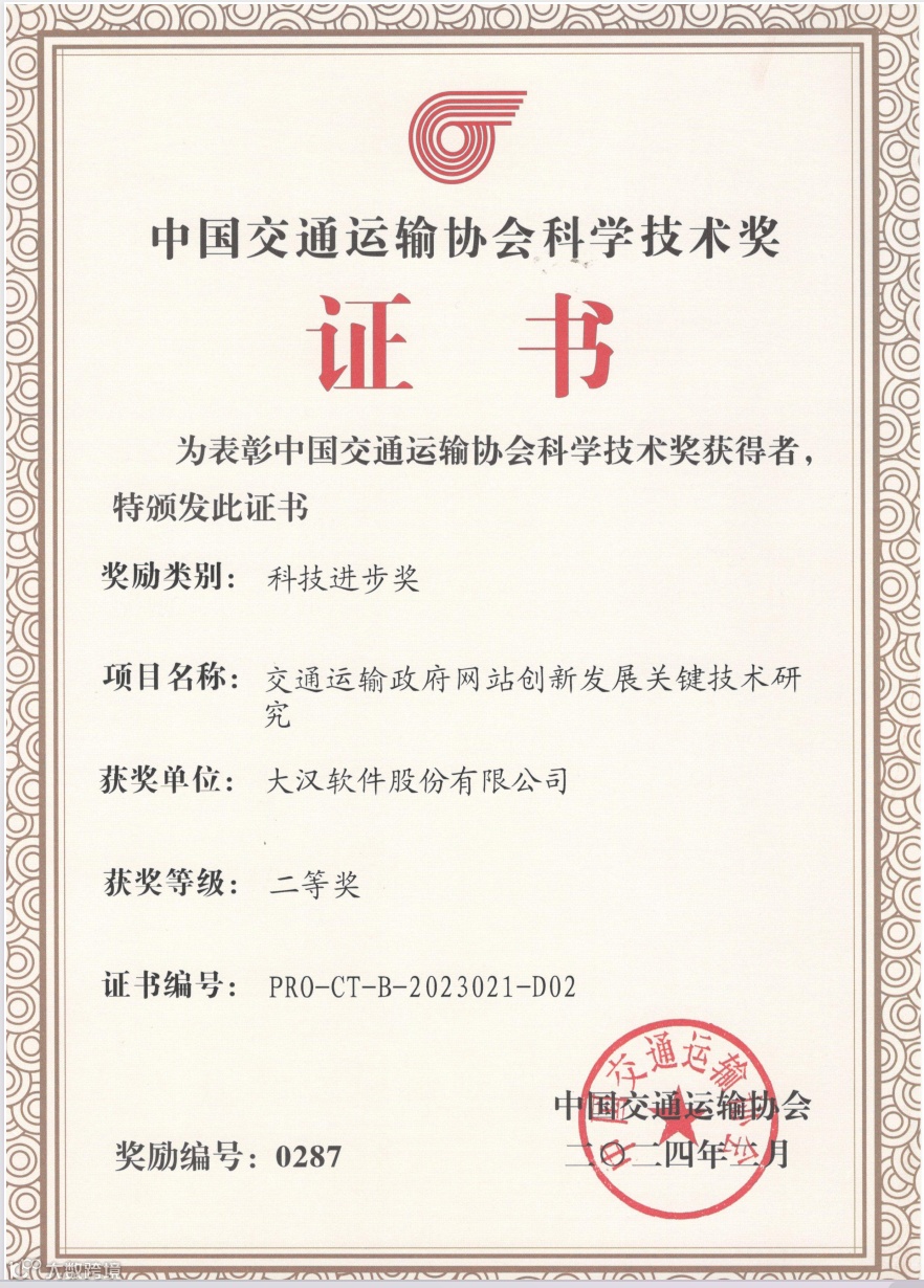 近日,2023年度中国交通运输协会科学技术奖表彰大会暨中国交通运输新技术新成果推广大会在湖南株洲召开。会上,公布了2023年度中国交通运输协会科学技术奖获奖项目,大汉软件参与建设的“交通运输政府网站创新发展关键技术研究”项目荣获中国交通运输协会科学技术奖二等奖。