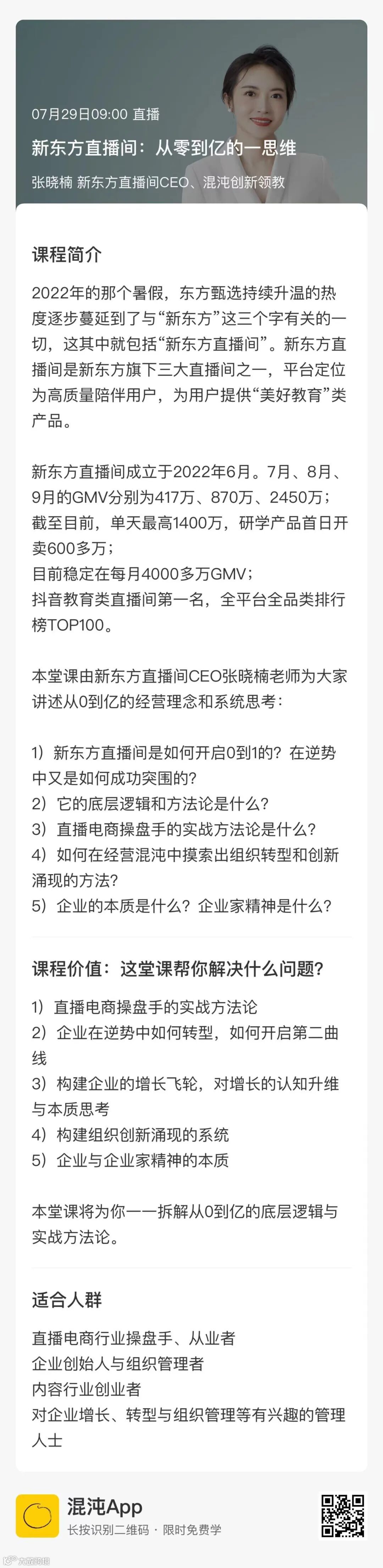 【课程简介】 本节课,我们邀请到了张晓楠——新东方直播间CEO、混沌创新领教,通过本堂课,你将收获: 1、直播电商操盘手的实战方法论; 2、企业在逆势中如何转型,如何开启第二曲线; 3、构建企业的增长飞轮,对增长的认知升维与本质思考; 4、构建组织创新涌现的系统; 5、企业与企业家精神的本质。