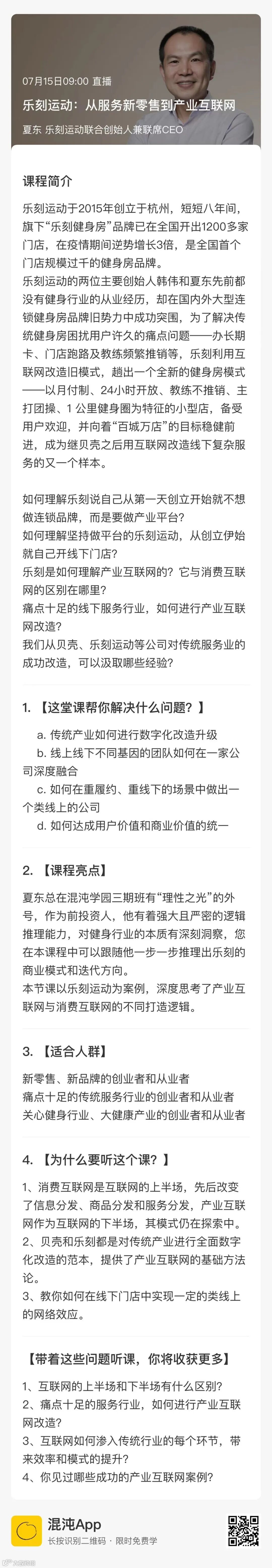 【课程简介】 本节课,我们邀请到了夏东——乐刻运动联合创始人兼联席CEO,混沌学园创新领教,通过本堂课,你将收获: 1、传统产业如何进行数字化改造升级; 2、线上线下不同基因的团队如何在一家公司深度融合; 3、如何在重履约、重线下的场景中做出一个类线上的公司; 4、如何达成用户价值和商业价值的统一。
