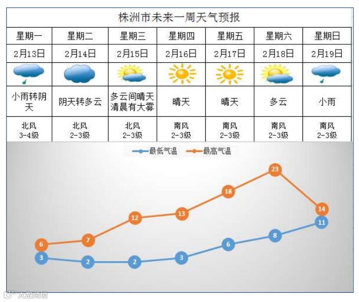 未来一周(2 月 13~19 日)前雨后晴,周二开始雨停转多云,15~18 日为连晴天气,19 日有新一轮冷空气影响。
