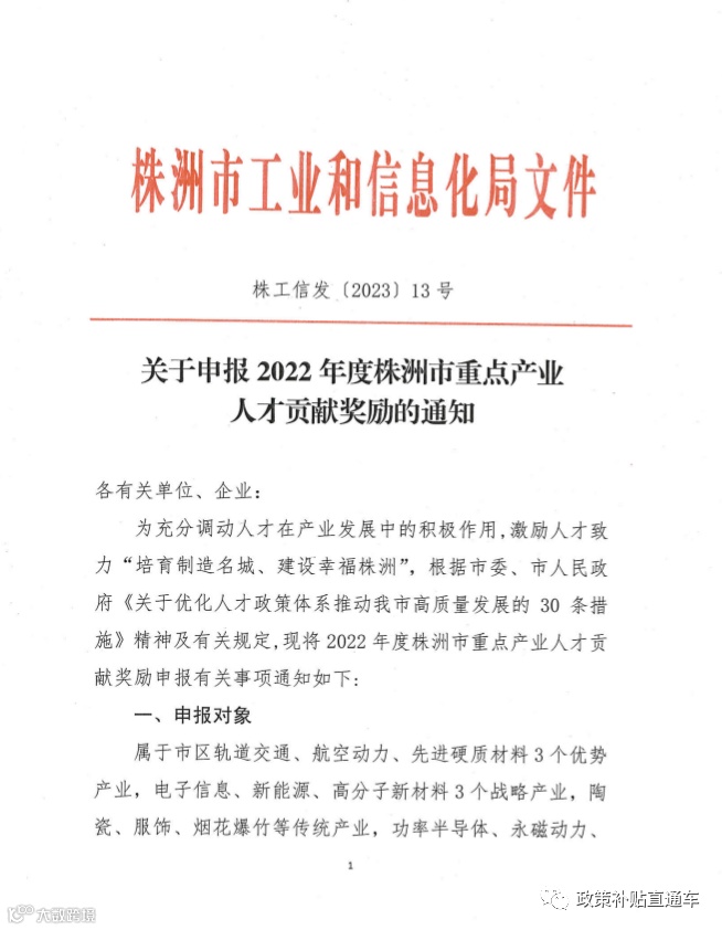 政策申报|株洲市工信局关于申报2022年度株洲市重点产业人才贡献奖励的通知!