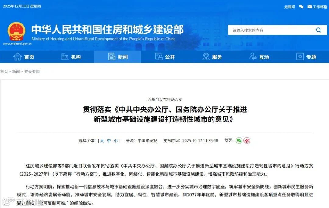 2025年8月,为深入贯彻落实《中共中央办公厅、国务院办公厅关于推进新型城市基础设施建设打造韧性城市的意见》,住房城乡建设部会同有关部门制定了《贯彻落实〈中共中央办公厅、国务院办公厅关于推进新型城市基础设施建设打造韧性城市的意见>行动方案(2025-2027年)》(以下简称“行动方案”),明确要求“坚持科技创新、数字赋能,探索推动新一代信息技术与城市基础设施建设深度融合,进一步夯实城市治理数字底座,筑牢城市安全新防线,创新城市民生服务新模式。”。