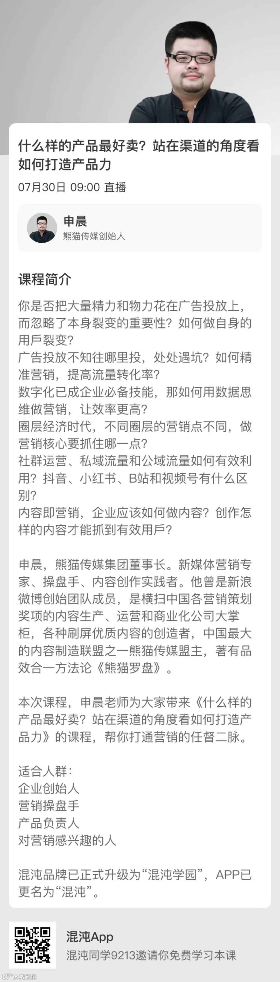 由大汉信息产业园和混沌大学联合推出的《什么样的产品最好卖?站在渠道的角度看如何打造产品力》线上直播课程: