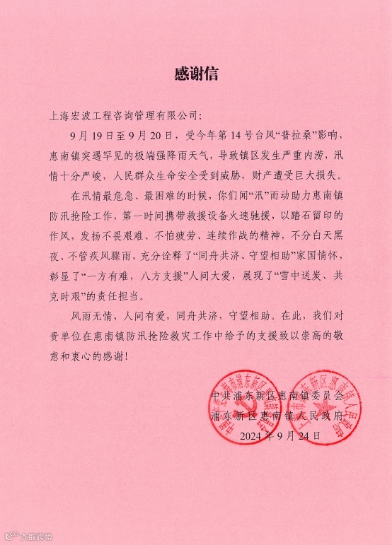 今年上海经历了两次“台风”直击,“贝碧嘉”及“普拉桑”以其强大的威力和不可预测的路径,在浙北至上海一带强势登陆。根据市排水管理事务中心实时调度,上海宏波集团汀滢突击队前往惠南镇积水严重区域支援抢排。近日,两位惠南镇政府的工作人员带着满满的感激之情来到宏波慰问,手中紧握着一面精心定制的锦旗,上面赫然绣着“台风无情人有情、紧急时刻伸援手”几个大字,字里行间流露出对我们工作的认可。