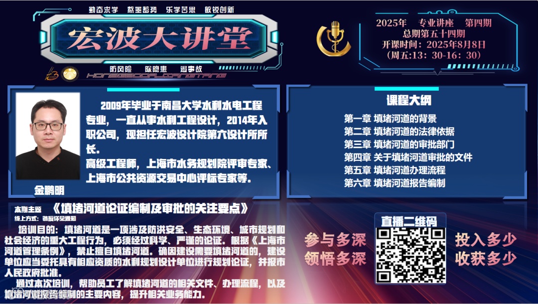 8 月 8 日,第四期《宏波大讲堂》顺利举行,本次课程以《填堵河道论证编制及审批的关注要点》为主题,吸引了众多员工参与。填堵河道作为一项与防洪安全、生态环境、城市规划以及社会经济紧密相连的重大工程行为,其科学性与严谨性至关重要。依据《上海市河道管理条例》,擅自填堵河道明确被禁止,若建设确实需要填堵河道,建设单位必须委托具备相应资质的水利规划设计单位开展规划论证,并报市人民政府批准。