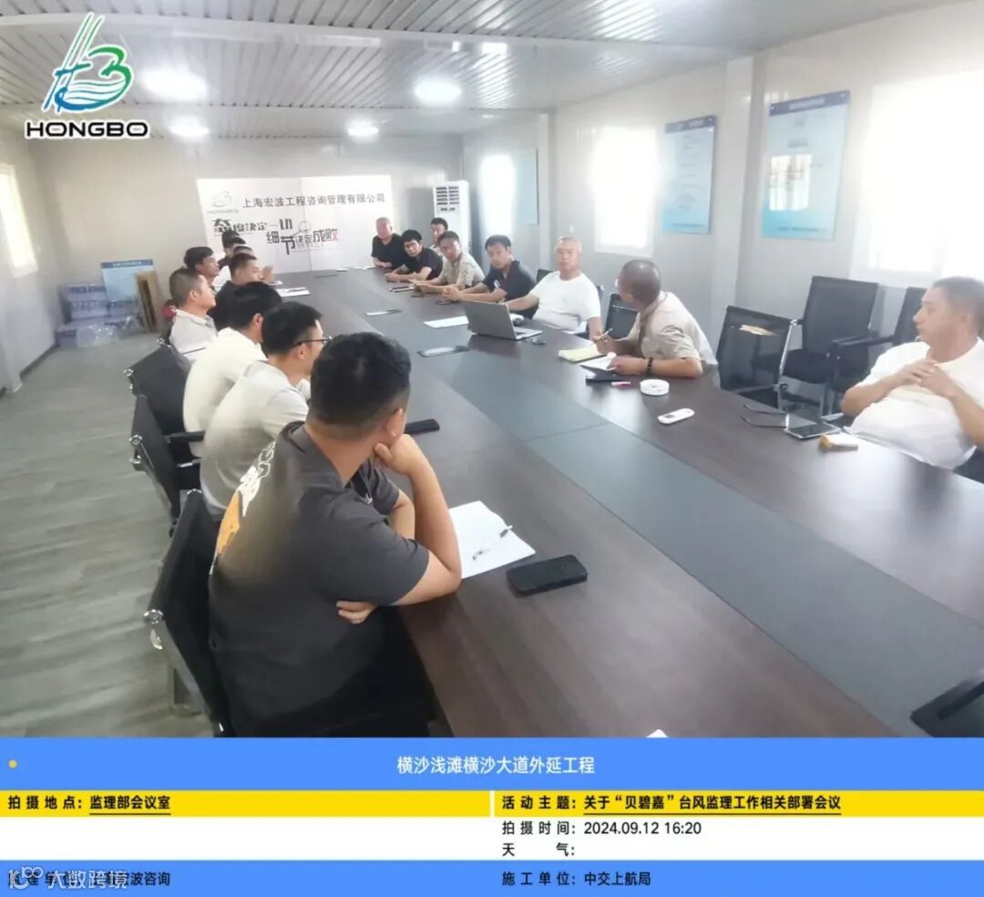 横沙浅滩项目召开台风部署会,检查现场,组织人员集中撤离。