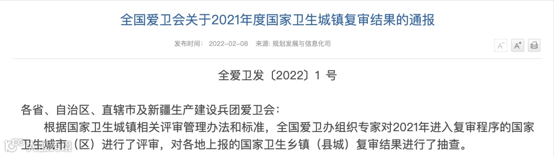 2月8日,全国爱卫会发出了2021年度国家卫生城镇复审结果的通报,重新确认