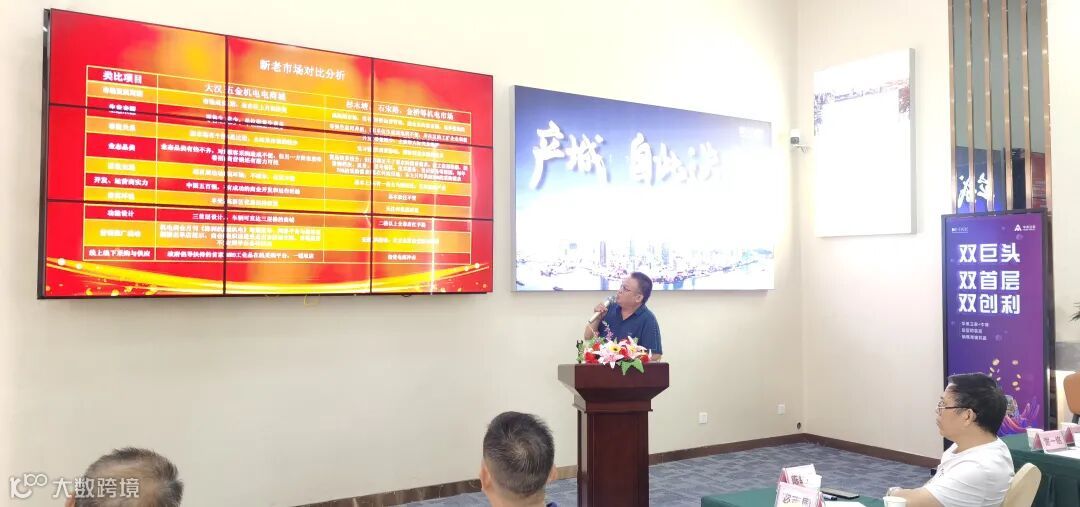 大汉五金机电电商城招商经理兼商会副秘书长陈怡芬在会上做了招商动员发言。通过PPT图文并茂的形式,他将自己的团队这两个月在全市各大同类市场收集调研得的相关信息,悉数展示给了在场的诸位领导和嘉宾们。陈经理在发言中指出,尽管园区现阶段仍有货品不太齐全等短板,但是,优越的地理位置和高新区产业园配置、丰富的政府支持扶持政策、完整的上下游产业链供应体系,专业化的园区运营管理、独有的线上线下两店一铺模式、本地行业商会的抱团集群加持等等一系列优势已经让电商城在同类市场里呈现出了碾压的态势,他呼吁商会的诸位要坚定信心,继续为园区的招商引商添砖加瓦。