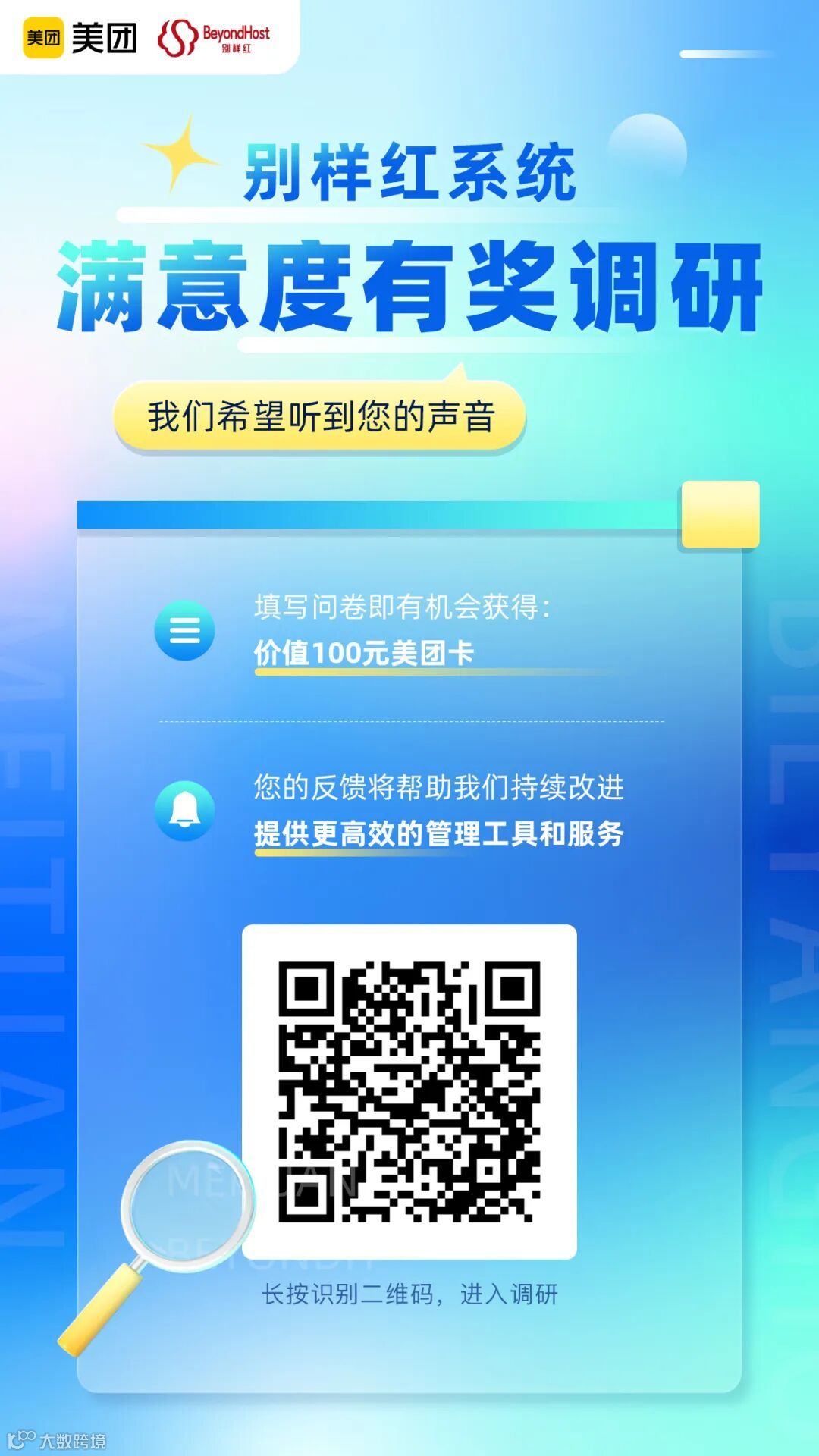 为感谢大家的参与和支持,我们将于调研活动结束后抽取完整填答的商家,送出价值100元的美团卡!