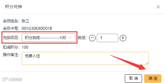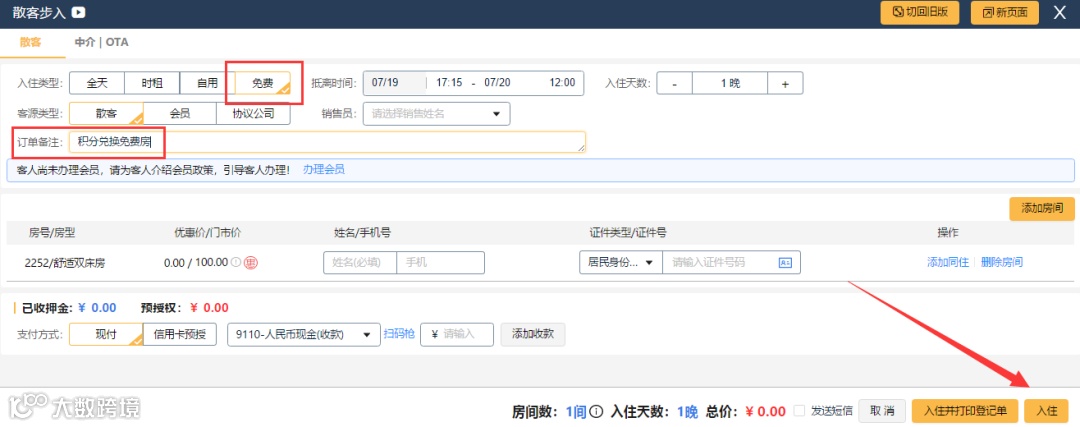 您可以在【客户关系】→【会员管理】→【查询修改】→【积分兑换】中兑换对应的类别,然后点击【散客步入】,给客户开个免费房入住。