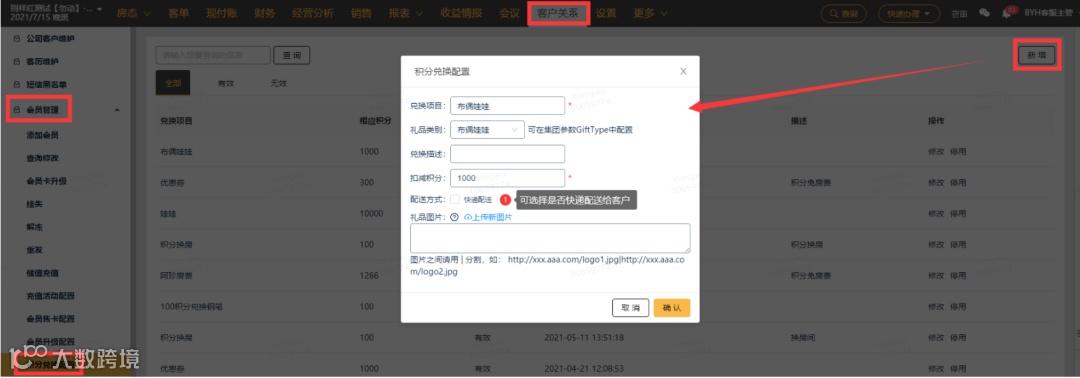 操作步骤:依次选择【客户关系】→【会员管理】→【积分兑换配置】→【新增】。