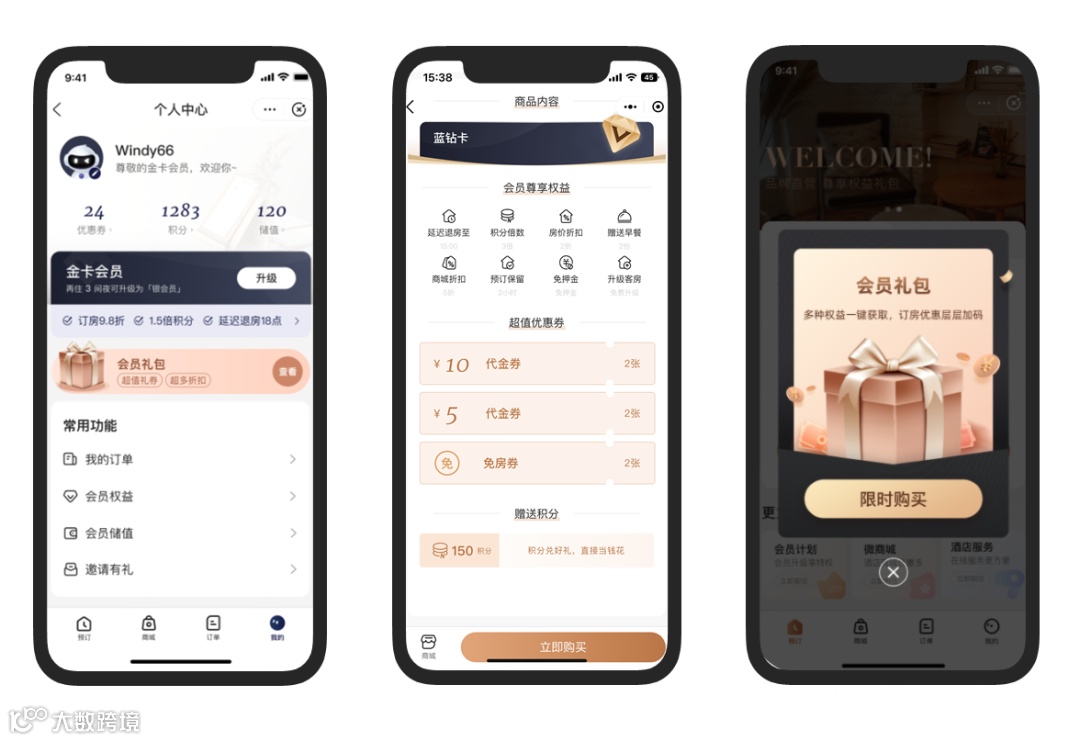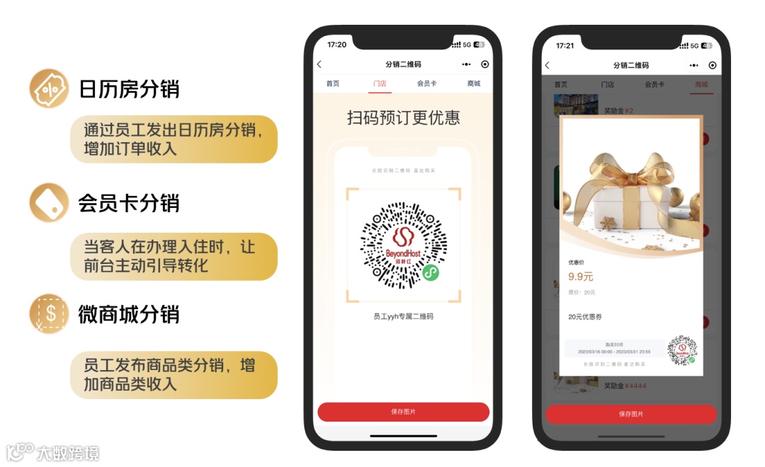 然后员工是需要去分销,有分销提成,他自然会去推客人转化。客人使用小程序订房也可以享受优惠,领一些优惠券也会在后续去复购。