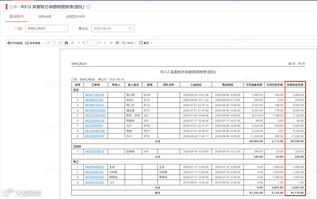 此报表是按照营业日进行统计的,跨月的订单数据统计也会跨月。比如,消费在7月,付款在8月,就会使报表当月的消费与付款之间产生差额,对应的订单明细建议可以查看“RS11宾客账明细报表/RS12宾客账总余额明细报表(固化)”。