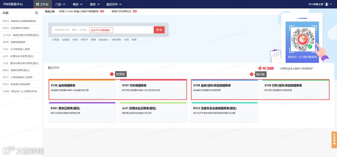 ①权责制交班:建议查询【SY06 消费明细报表】和付【SY07 付款明细报表】;