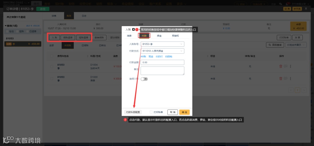 ②实际消费金额和实际付款金额不一致:客人房费199,支付押金100+房费199元。