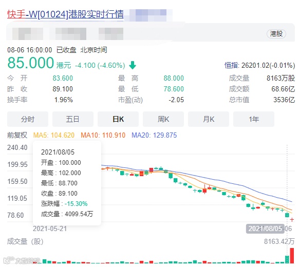 昨天快手暴跌又跌了15%,报价89.65港元,较招股价115港元跌了22%,较高点417.8港元跌了78.54%,市值蒸发了1.365万亿港元,目前美团的市值才1.29万亿港元,也就是说快手直接蒸发了一个美团的体量现在就剩3500亿市值了。