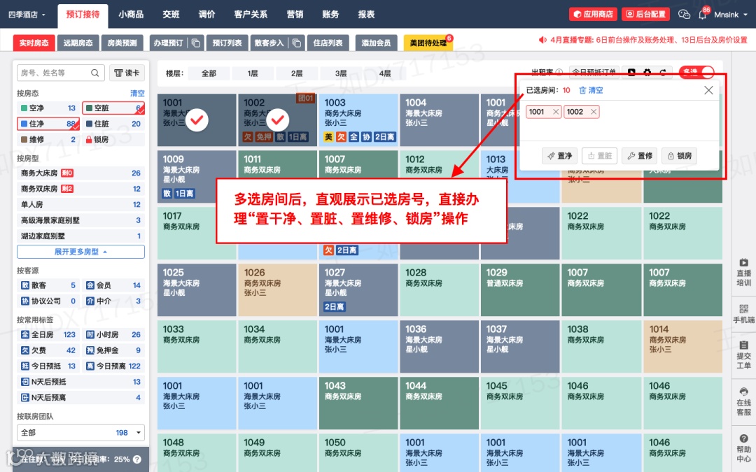 当您多选房间后,能够直观展示已选房号,并在确认房间后直接办理“置干净、置脏、置维修、锁房”操作,有效减少误操作。