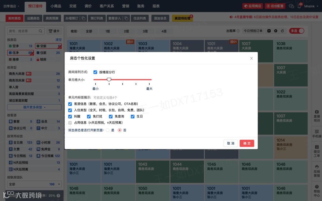因每个客人操作习惯不同,我们在房态操作界面增加了个性化设置。